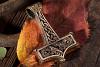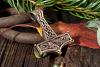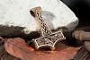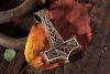 Ein Thorshammer als massiver Schmuck-Anhänger, verziert mit Wikinger-Drachen und Knotenmuster.