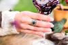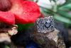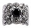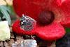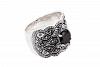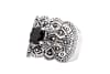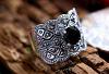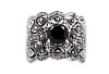 Imposanter, sehr hoher Ring mit einem schwarzen Stein.