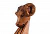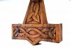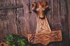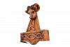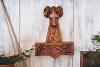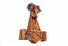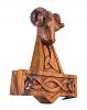 Ein mächtiger Thorshammer aus Holz mit einem Widderkopf und Wikinger-Knoten.