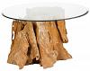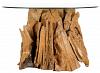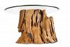 Eleganter und wilder Teakholztisch mit stabiler Glasplatte.