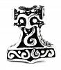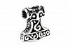 Auf dem mit Wikinger-Symbolen verzierten Thorshammer thront ein Gesicht.
