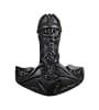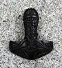 Kraftvoller handgeschnitzter Thorshammer aus schwarzem Holz.