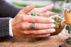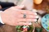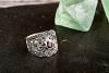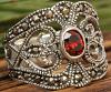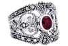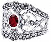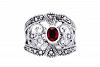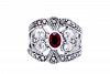 Edler Ring mit einem dunkelroten Stein und feinen Ornamentik-Mustern.