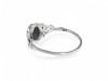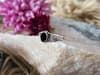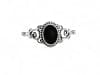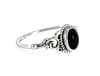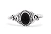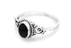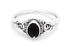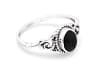 Der feine Silberring überzeugt durch sein zartes, dekoratives Design und den tiefschwarzen, ovalen Schmuckstein, der elegant im Mittelpunkt steht.