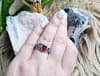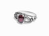 Im Zentrum steht ein wunderschöner, tiefrot funkelnder Stein in ovalem Schliff, der dem Ring einen edlen Farbakzent gibt.